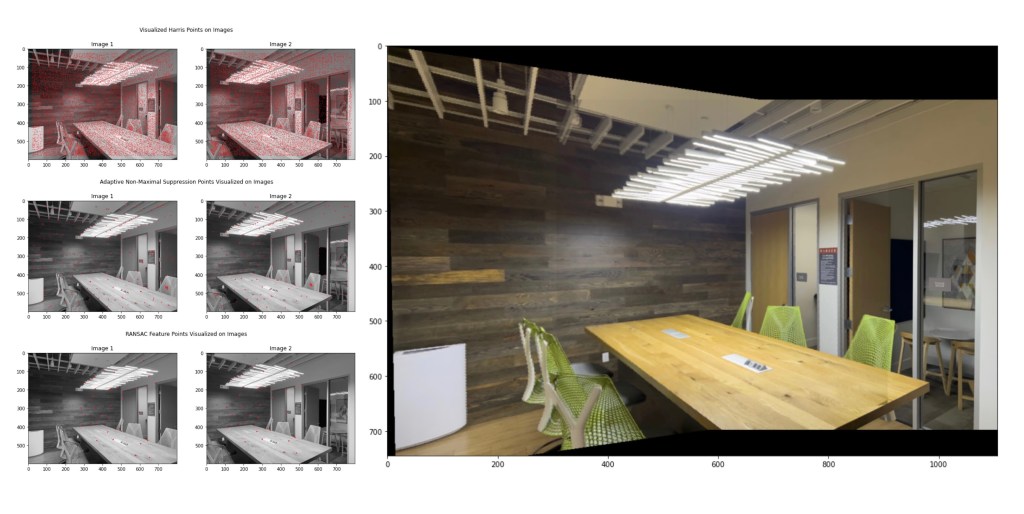 A comprehensive project that seamlessly stitches images together through a blend of manual and automatic feature selection methods, alongside various blending techniques. Starting with manually selected feature points for homography transformations, it evolves to adopt automatic feature selection algorithms, using Harris Corners Detection to identify feature points and Adaptive Non-Maximal Suppression to distill the most crucial ones. Each feature point is then described by a Feature Descriptor that encompasses its neighboring pixel information for matching. The matching procedure is facilitated by Random Sample Consensus (RANSAC) to determine the most fitting set of matching features, subsequently utilized to calculate the final homography matrix for image warping and blending.